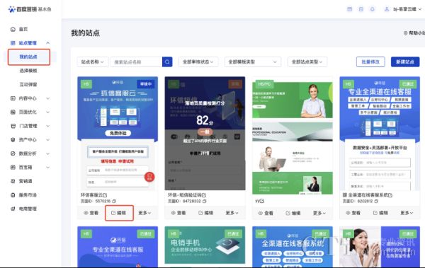 8、接下來就可以使用新建的環(huán)信客服咨詢方案,選擇需要加入客服的站點(diǎn),點(diǎn)擊編輯或者新建一個(gè)站點(diǎn)都可以。