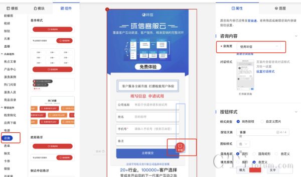 9、在營(yíng)銷組件中將咨詢組件加到頁面中,變?cè)谟覀?cè)咨詢組件的編輯頁咨詢內(nèi)容-咨詢頁中選擇咨詢方案,接下來對(duì)應(yīng)的站點(diǎn)網(wǎng)頁就可以使用客服組件并接入到環(huán)信客服系統(tǒng)中。