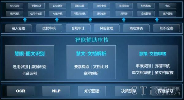 “智能輔助審核”產(chǎn)品生態(tài)包含技術(shù)層、產(chǎn)品層、場景層和解決方案四個層次。通過OCR、NLP、知識圖譜和決策引擎等AI底層技術(shù),有效支撐“慧眼”、“慧文”、和“慧策”三個產(chǎn)品矩陣,實現(xiàn)金融數(shù)據(jù)從結(jié)構(gòu)化到知識化、進而到金融業(yè)務(wù)系統(tǒng)化決策?;诋a(chǎn)品矩陣,支撐錄入復(fù)核、授權(quán)審核、合規(guī)審計等場景化功能,進而實現(xiàn)對公信貸、零售信貸、企業(yè)財務(wù)等解決方案的落地,為企業(yè)降低成本和風險,提升決策效能。