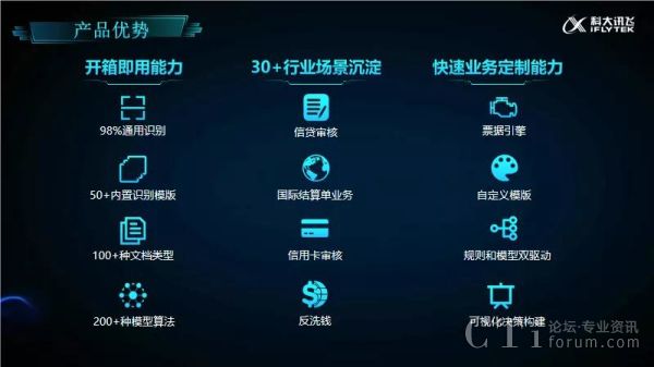 在場景沉淀方面,基于多年的金融落地積累,科大訊飛沉淀了信貸審核、國際結(jié)算單業(yè)務(wù)、信用卡審核和反洗錢等解決方案,能夠為用戶提供一站式的產(chǎn)品+解決方案+咨詢能力,創(chuàng)造實際業(yè)務(wù)價值。