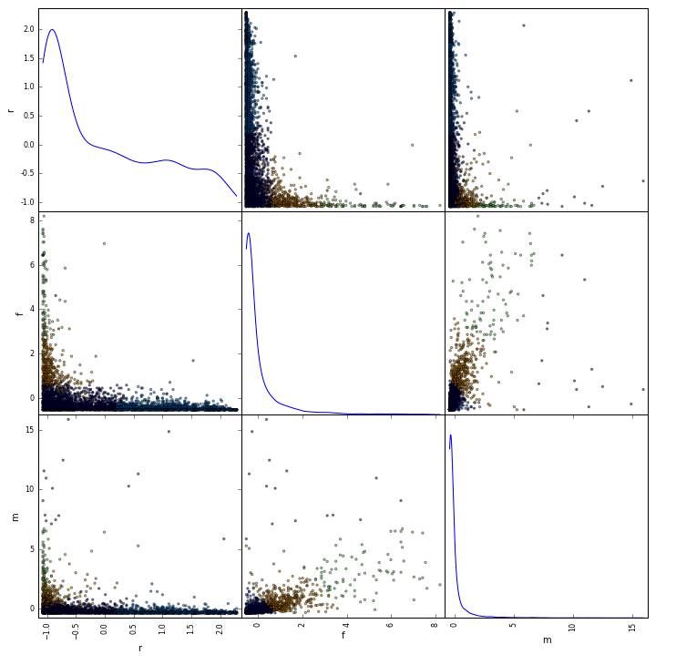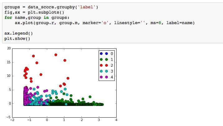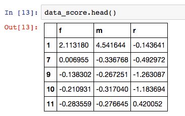 上圖的三列數(shù)據(jù)是經(jīng)過標(biāo)準(zhǔn)化后的用戶消費數(shù)據(jù)。值越接近0,說明離平均水平越近。r值因為是最近一次消費時間,所以值越小,說明時間越接近,值越大,說明消費越久遠(yuǎn)。