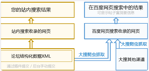 4、上圖是百度站內(nèi)搜索官方給出的影響機(jī)制圖。您在百度站內(nèi)搜索中提交的數(shù)據(jù)(包括通過(guò)插件提交或在后臺(tái)手動(dòng)提交)除了被站內(nèi)搜索全部收錄外,還會(huì)提交給百度網(wǎng)頁(yè)搜索(即大搜索)進(jìn)行抓取,也就是在大搜索常規(guī)的網(wǎng)頁(yè)發(fā)現(xiàn)渠道之外額外補(bǔ)充來(lái)自站內(nèi)搜索的渠道,從而提升大搜索對(duì)您站點(diǎn)的收錄情況。
