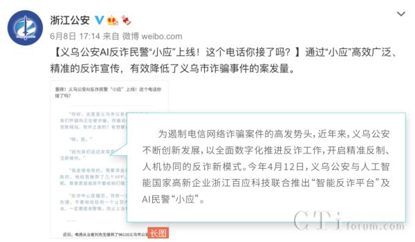 “AI民警小應(yīng)”的出現(xiàn),讓一線民警擺脫了重復(fù)性、高強(qiáng)度的預(yù)警線索確認(rèn)工作,充分釋放警力資源;也能夠充分發(fā)揮AI技術(shù)優(yōu)勢,及時(shí)精準(zhǔn)攔截,全時(shí)段勸阻可能受騙的群眾,守護(hù)老百姓的“錢袋子”。數(shù)據(jù)顯示,AI民警與市民的有效溝通率高達(dá)約95%,成功有效勸阻上萬起市民受騙情況,得到了當(dāng)?shù)厥」矎d的官方點(diǎn)贊。