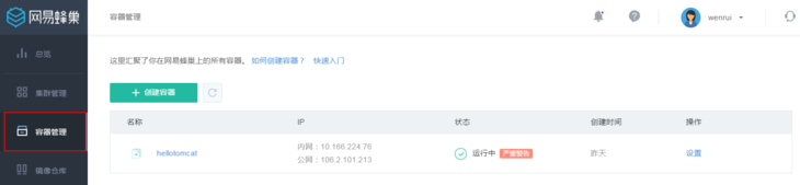 容器管理入口位于網(wǎng)易蜂巢首頁的容器管理選項,點擊「容器管理」,顯示當前用戶的所有容器列表。