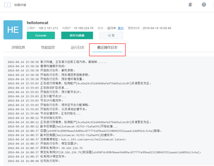 在容器詳情頁面,點擊「最近操作日志」標簽,將會顯示該容器最近的操作日志,創(chuàng)建、設置等操作都會有相應日志產生,具體如下圖所示: