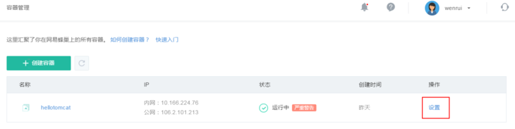你可以在此創(chuàng)建容器,設置容器,查看容器狀態(tài)等。點擊容器名稱,進入容器詳情。