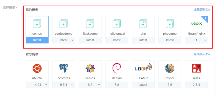 我的鏡像中為用戶自定義的鏡像以及在蜂巢鏡像中心收藏的鏡像,如下圖所示。其中,收藏的鏡像會在鏡像右上角用星號標記。注意:默認顯示的鏡像數(shù)量有限,你可以點擊右上角「全部顯示」查看所有鏡像。