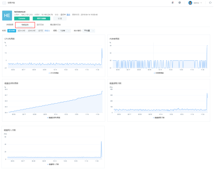 在容器詳情頁面,點擊「性能監(jiān)控」標簽,展示了相應容器的性能監(jiān)控詳情。性能監(jiān)控主要針對 CPU 利用率、內存利用率、磁盤空間利用率、磁盤讀寫次數(shù)進行監(jiān)控,實時顯示當前容器的 CPU 利用率及內存使用大小,如下圖所示。