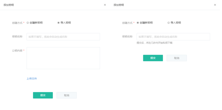 導入密鑰:選擇「導入密鑰」,上傳本地公鑰文件或填寫公鑰內容導入本地密鑰。