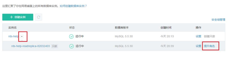 在數(shù)據(jù)庫的主界面,點擊實例名稱右側的箭頭(如果存在),可以查看該實例的只讀實例。對于只讀實例,「操作」列提供了「提升角色」的功能,如下圖所示。點擊「提升角色」并確認,能夠解除只讀實例與源實例的關系,將只讀實例變成一個普通的非高可用實例。