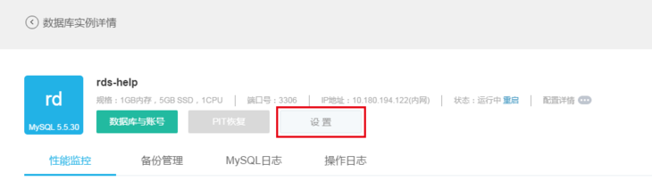 2.在數(shù)據(jù)庫的主界面,點擊該實例的名稱,進入該實例的「實例詳情」頁面,再點擊「設置」按鈕,如下圖所示: