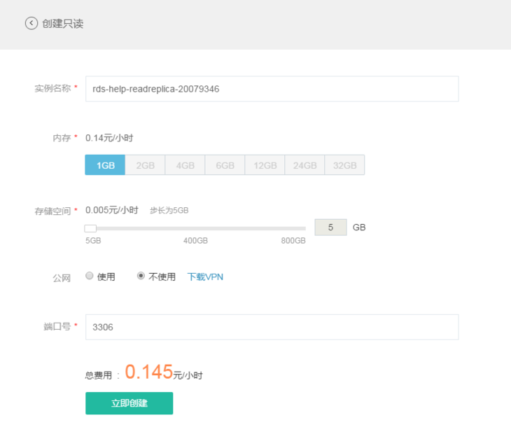 只讀實例的創(chuàng)建界面中,數(shù)據(jù)庫引擎和源實例一致,不可更改,其余內(nèi)容與創(chuàng)建實例相同,如下圖所示: