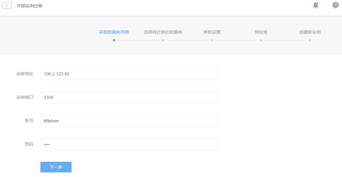 進入「獲取數(shù)據(jù)庫列表」步驟,需要輸入待遷移的外部數(shù)據(jù)庫 IP 地址、端口、數(shù)據(jù)庫賬號以及密碼等信息,如下圖所示,輸入完畢后,點擊「下一步」: