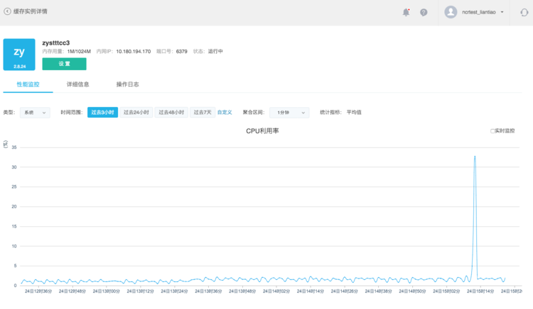 在「緩存服務」主界面,點擊該實例名稱,進入緩存實例詳情頁面。這里包含了「性能監(jiān)控」、「詳細信息」和「操作日志」功能,并提供「設置」按鈕。
