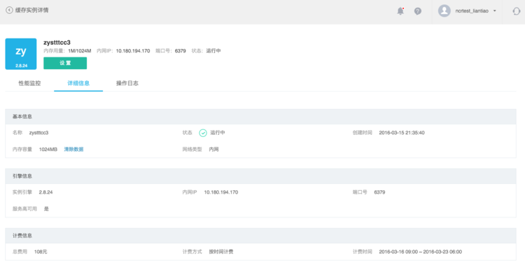 實例詳情頁面頂部展示實例名稱、內存用量、網(wǎng)絡地址、運行狀態(tài)等信息。提供「設置」按鈕修改實例信息。 點擊「詳細信息」標簽,可以查看更多實例詳情。