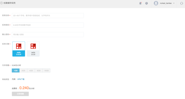 你可以在「緩存服務」主界面,點擊「創(chuàng)建緩存實例」來創(chuàng)建一個新的緩存實例,創(chuàng)建實例界面如下所示,操作十分便捷,只需填寫實例名稱、實例密碼,選擇實例引擎和實例內存容量,然后點擊「立即創(chuàng)建」按鈕,即可開始創(chuàng)建實例。