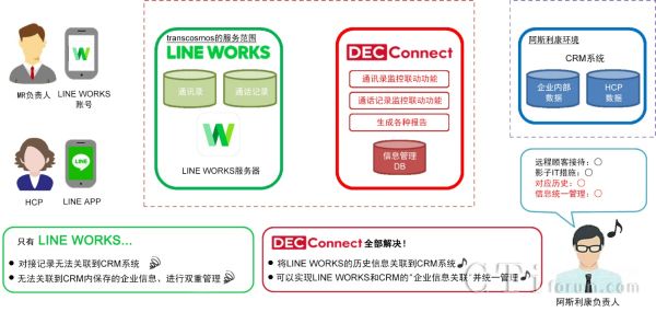 隨著遠(yuǎn)程辦公成為主旋律,阿斯利康為了促進(jìn)與醫(yī)務(wù)人員之間的溝通流暢,考慮采用“LINE WORKS”,然而卻面臨著企業(yè)目前使用的顧客關(guān)系管理系統(tǒng)(CRM)的各項(xiàng)數(shù)據(jù)無法與醫(yī)藥代表的對接記錄等各種信息進(jìn)行統(tǒng)一管理的問題。于是,transcosmos通過提供“DEC Connect”(*1)服務(wù)--一種定制化的LINE的API解決方案,實(shí)現(xiàn)了“LINE WORKS”與CRM之間的數(shù)據(jù)關(guān)聯(lián)。憑借此項(xiàng)服務(wù)能夠?qū)?ldquo;LINE WORKS”上與醫(yī)務(wù)人員的對接記錄等各類信息進(jìn)行統(tǒng)一管理。transcosmos今后將基于和LINE官方賬號的合作,進(jìn)一步強(qiáng)化LINE WORKS與CRM的協(xié)同。