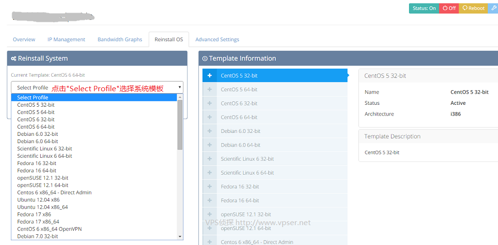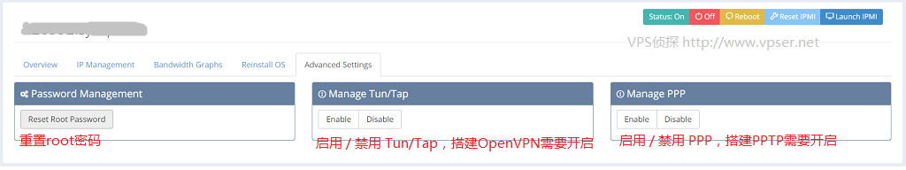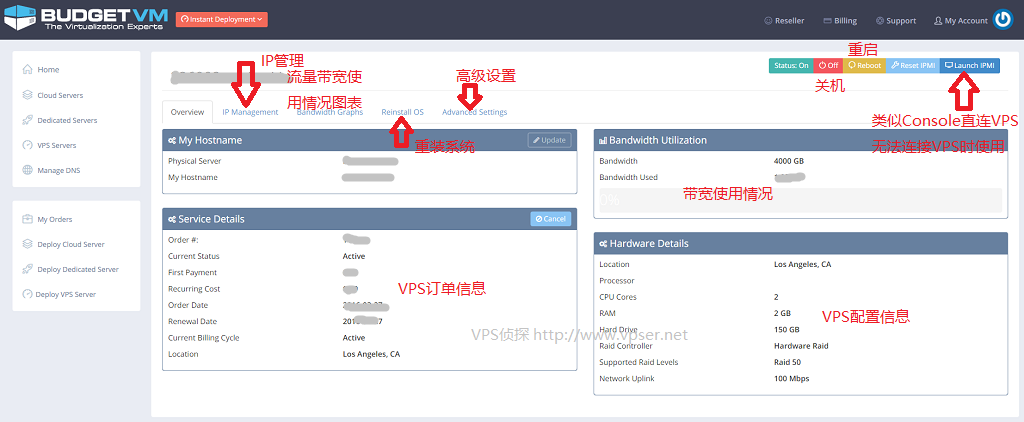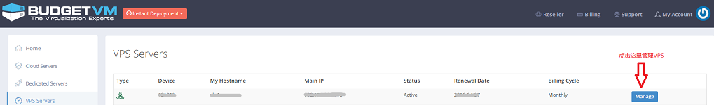 點擊"VPS Servers"就會進入VPS列表,點擊對應VPS后面的"Manage"就會進入該VPS管理界面