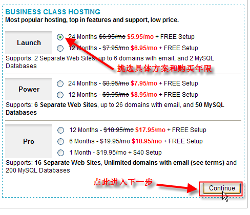 4、如果你在第2步選擇了Business Class Hosting,那么到這一步會(huì)有三個(gè)級(jí)別和相應(yīng)的租用期讓你選擇,分別是Launch,Power,Pro,它們的性能配置不同,價(jià)格也有所不同。我們以L(fǎng)aunch方案的24個(gè)月購(gòu)買(mǎi)期為例,然后點(diǎn)擊“Continue”繼續(xù),見(jiàn)下圖。