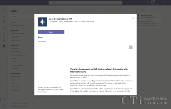 通過進一步合作,AudioCodes和Microsoft已讓Voca成為了一款專為對話式IVR應(yīng)用提供的、易于使用的Teams應(yīng)用??蓪崿F(xiàn)直接從Teams的APP商店調(diào)用Voca,直接在云端安裝和部署,簡潔簡單,無需事先掌握專業(yè)技能,即可一步步按照導(dǎo)引完成安裝。