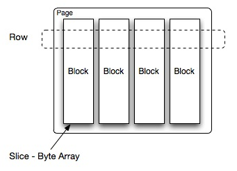 Presto中處理的最小數(shù)據(jù)單元是一個(gè)Page對(duì)象,Page對(duì)象的數(shù)據(jù)結(jié)構(gòu)如下圖所示。一個(gè)Page對(duì)象包含多個(gè)Block對(duì)象,每個(gè)Block對(duì)象是一個(gè)字節(jié)數(shù)組,存儲(chǔ)一個(gè)字段的若干行。多個(gè)Block橫切的一行是真實(shí)的一行數(shù)據(jù)。一個(gè)Page最大1MB,最多16*1024行數(shù)據(jù)。