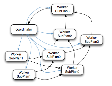 Coordinator通過(guò)HTTP協(xié)議調(diào)用Worker節(jié)點(diǎn)的 /v1/task 接口將執(zhí)行計(jì)劃分配給所有Worker節(jié)點(diǎn)(圖中藍(lán)色箭頭)