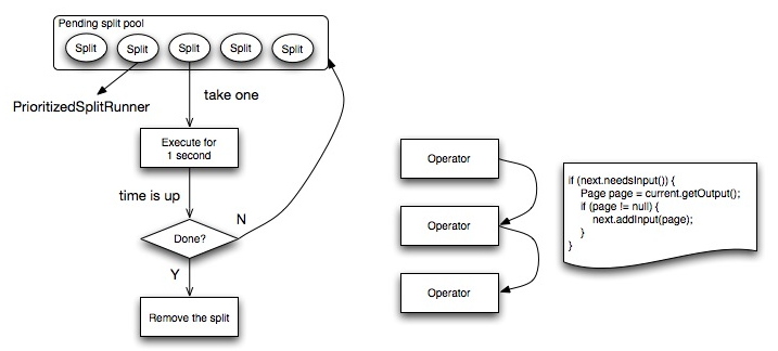 每個(gè)任務(wù)的執(zhí)行流程如下圖右側(cè),依次遍歷所有Operator,嘗試從上一個(gè)Operator取一個(gè)Page對(duì)象,如果取得的Page不為空,交給下一個(gè)Operator執(zhí)行。