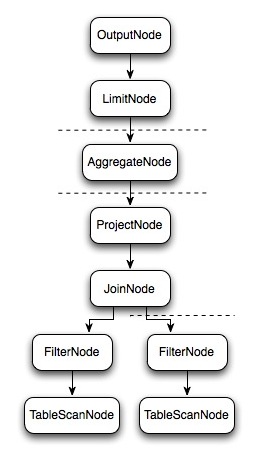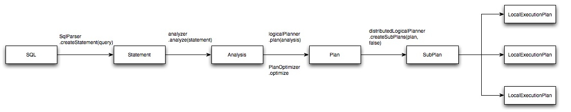 如下圖中所示從SQL編譯為最終的物理執(zhí)行計(jì)劃大概分為5部,最終生成在每個(gè)Worker節(jié)點(diǎn)上運(yùn)行的LocalExecutionPlan,這里不詳細(xì)介紹SQL解析為邏輯執(zhí)行計(jì)劃的過(guò)程,通過(guò)一個(gè)SQL語(yǔ)句來(lái)理解查詢計(jì)劃生成之后的計(jì)算過(guò)程。