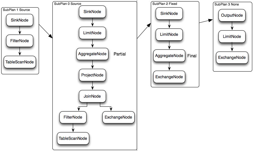PlanDistribution表示一個(gè)查詢Stage的分發(fā)方式,邏輯執(zhí)行計(jì)劃圖中的4個(gè)SubPlan共有3種不同的PlanDistribution方式:Source表示這個(gè)SubPlan是數(shù)據(jù)源,Source類型的任務(wù)會(huì)按照數(shù)據(jù)源大小確定分配多少個(gè)節(jié)點(diǎn)進(jìn)行執(zhí)行;Fixed表示這個(gè)SubPlan會(huì)分配固定的節(jié)點(diǎn)數(shù)進(jìn)行執(zhí)行(Config配置中的query.initial-hash-partitions參數(shù)配置,默認(rèn)是8);None表示這個(gè)SubPlan只分配到一個(gè)節(jié)點(diǎn)進(jìn)行執(zhí)行。在下面的執(zhí)行計(jì)劃中,SubPlan1和SubPlan0 PlanDistribution=Source,這兩個(gè)SubPlan都是提供數(shù)據(jù)源的節(jié)點(diǎn),SubPlan1所有節(jié)點(diǎn)的讀取數(shù)據(jù)都會(huì)發(fā)向SubPlan0的每一個(gè)節(jié)點(diǎn);SubPlan2分配8個(gè)節(jié)點(diǎn)執(zhí)行最終的聚合操作;SubPlan3只負(fù)責(zé)輸出最后計(jì)算完成的數(shù)據(jù)。