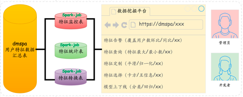 但從用戶特征來看,其實(shí)會(huì)有很多的重復(fù)工作,不同的項(xiàng)目需要的用戶特征其實(shí)有很多是一樣的,為了減少冗余的提取工作,也為了節(jié)省計(jì)算資源,建立特征平臺(tái)的需求隨之誕生,特征平臺(tái)只需要聚合各個(gè)開發(fā)人員已經(jīng)提取的特征數(shù)據(jù),并提供給其他人使用。特征平臺(tái)主要使用Spark的批處理功能來完成數(shù)據(jù)的提取和聚合。
