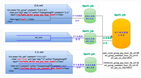 在圖中,我們可以看到特征聚合分兩層,第一層是各個(gè)業(yè)務(wù)數(shù)據(jù)內(nèi)部聚合,比如團(tuán)購的數(shù)據(jù)配置文件中會(huì)有很多的團(tuán)購特征、購買、瀏覽等分散在不同的表中,每個(gè)業(yè)務(wù)都會(huì)有獨(dú)立的Spark任務(wù)來完成聚合,構(gòu)成一個(gè)用戶團(tuán)購特征表;特征聚合是一個(gè)典型的join任務(wù),對(duì)比MapReduce性能提升了10倍左右。第二層是把各個(gè)業(yè)務(wù)表數(shù)據(jù)再進(jìn)行一次聚合,生成最終的用戶特征數(shù)據(jù)表。