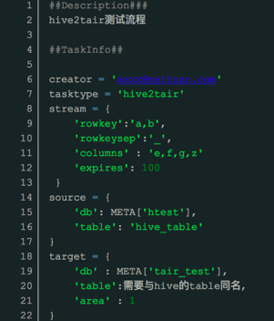 source用于指定Hive表源數(shù)據(jù),target指定目標(biāo)Tair的庫和表,這兩個(gè)參數(shù)可以用于調(diào)度系統(tǒng)解析該ETL的上下游依賴關(guān)系,從而很方便地加入到現(xiàn)有的ETL生產(chǎn)體系中。