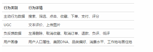 數(shù)據(jù)乃算法、模型之本。美團(tuán)作為一個交易平臺,同時具有快速增長的用戶量,因此產(chǎn)生了海量豐富的用戶行為數(shù)據(jù)。當(dāng)然,不同類型的數(shù)據(jù)的價(jià)值和反映的用戶意圖的強(qiáng)弱也有所不同。
