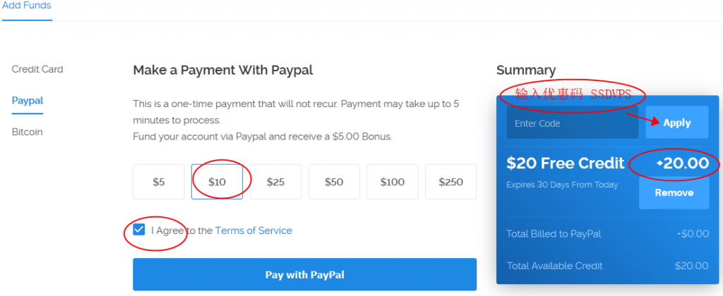 如果說你沒有信用卡,但是你有Paypal 賬號,那么你需要先點擊上面的Expires 60Days From Today 后面的Remove按鈕(謹(jǐn)慎操作,Vultr只給一次機會,選擇信用卡的同學(xué)切勿選擇,本操作僅限paypal支付同學(xué)使用 ),輸入優(yōu)惠碼 SSDVPS 獲得20美元一個月的使用權(quán)。
