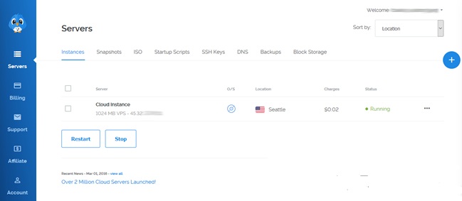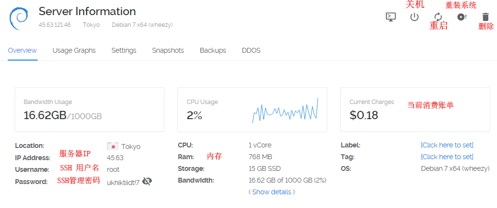 Vultr 的這個控制面板還是比較清新的,VPS的所有功能都在一個頁面集中,服務(wù)器停止,重新啟動,重裝系統(tǒng),刪除服務(wù)器等指示清晰,非常容易管理。