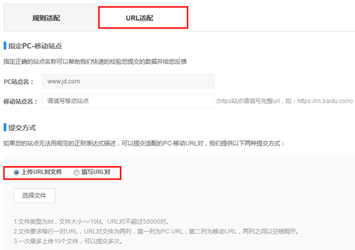 當(dāng)規(guī)則適配不能滿足適配關(guān)系的表達(dá)時(shí),可以通過(guò)“URL對(duì)文件上傳”功能,將主體內(nèi)容相同的PC鏈接和移動(dòng)鏈接提交給百度。