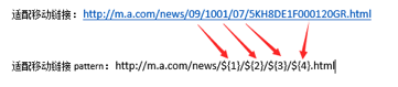 1)規(guī)則適配:當(dāng)pc地址和移動(dòng)地址存在規(guī)則(pattern)的匹配關(guān)系時(shí)(如PC頁(yè)面www.jb51.net/picture/12345.html,移動(dòng)頁(yè)面m.jb51.net/picture/12345.html),可以使用規(guī)則適配,添加pc和移動(dòng)的正則表達(dá)式。強(qiáng)烈建議您使用規(guī)則適配,一次提交成功生效后,對(duì)于新增同規(guī)則的URL可持續(xù)生效,不必再進(jìn)行多次提交。同時(shí)該方式處理周期相對(duì)URL適配更短,且易于維護(hù)和問題排查,是百度推薦使用的提交方式。