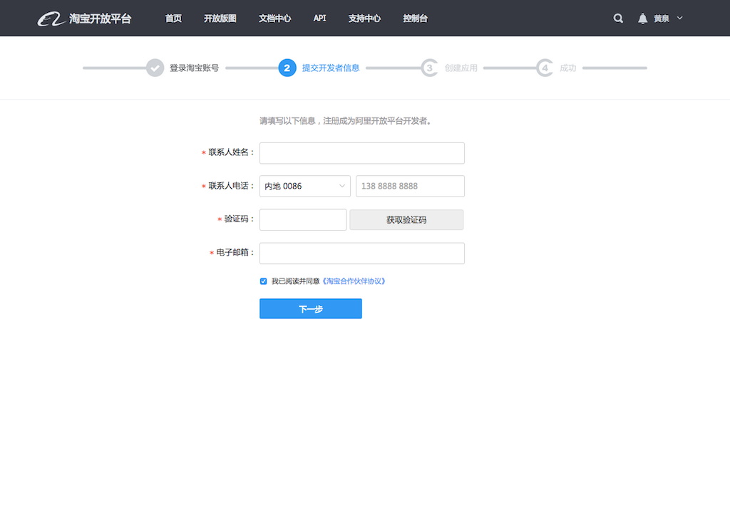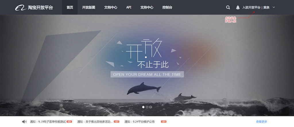打開開放平臺首頁,使用淘寶賬號登陸,