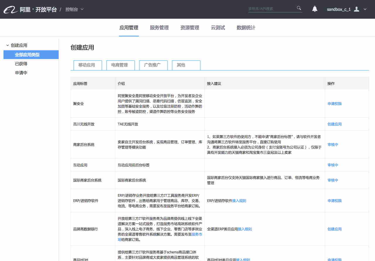 開放平臺目前將所有開放的業(yè)務(wù)分為移動應(yīng)用、電商管理、廣告推廣以及其他4類。