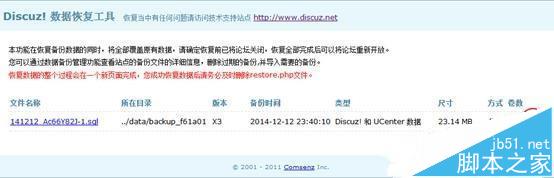18、恢復數(shù)據(jù)前請在 Discuz! 安裝文件目錄下utility文件夾內(nèi)找到 restore.php 文件,然后將 restore.php 文件上傳到程序文件夾data目錄下。為了您站點的安全,成功恢復數(shù)據(jù)后請務必及時刪除 restore.php 文件。(我們可以重新下載一個全新的DZ然后上傳需要的文件)
