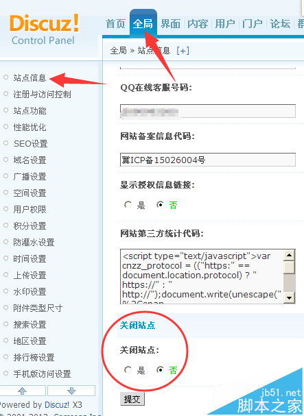 1、首先我們需要登錄DZ論壇后臺,在全局設置里邊,關閉站點,防止網(wǎng)站出現(xiàn)新數(shù)據(jù)導致備份數(shù)據(jù)不完整。如圖: