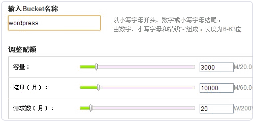 1、進(jìn)入:http://developer.baidu.com/bae/bcs/bucket/,點(diǎn)擊“創(chuàng)建Bucket”,輸入名稱及需要的配額,大小最好多選點(diǎn),記下你的Bucket名稱,備用。