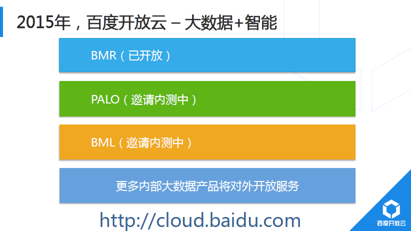 最后,向大家簡要介紹百度開放云。2014年,百度正式?jīng)Q定將服務(wù)內(nèi)部業(yè)務(wù)多年的云計算技術(shù)正式對外提供服務(wù),即百度開放云,對應(yīng)官網(wǎng)http://cloud.baidu.com。百度開放云大數(shù)據(jù)方面,BMR已經(jīng)對外開放,而更多的大數(shù)據(jù)分析和服務(wù)都還未對外開放。BMR集群上可以做到按需部署,用戶專享,更關(guān)鍵的是完全兼容開源的Hadoop/Spark平臺,開放云客戶基于Hadoop、Spark、Hbase等已經(jīng)實現(xiàn)的大數(shù)據(jù)業(yè)務(wù)幾乎不用修改就可以平滑遷移到云上。多維分析服務(wù)Palo,它完全兼容MySQL網(wǎng)絡(luò)協(xié)議,因此,客戶朋友們熟悉的Mysql Client的工具均可使用。