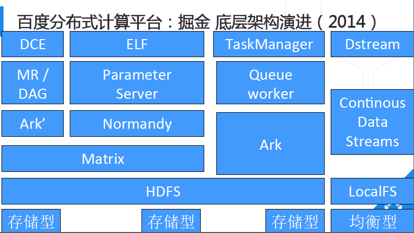 2014年,BML機器學(xué)習(xí)執(zhí)行引擎遷移到ELF第三代并行計算框架, ELF采用ParameterServer架構(gòu),大幅降低機器學(xué)習(xí)算法開發(fā)代價,對比于百度的第二代框架DVCE,在開發(fā)效率方面有大幅度的提升。離線計算方面,完成了Native C++ DAG引擎上線,百度內(nèi)部叫DCE(Distributed ComputingEngine)。