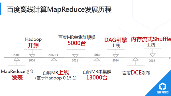 首先介紹主要的離線計算模型——MapReduce,百度從2007年開始引進Hadoop 0.15.1,隨后快速發(fā)展,2011年百度的MR單集群規(guī)模達到5000臺,到2013年已經(jīng)多達1.3萬臺,這也是截止到目前為止全世界最大的單集群。Hadoop全集群規(guī)模為10萬量級, 作業(yè)量達到了百萬量級,日均CPU利用率超過80%,遠超業(yè)界同行,百度開放云(http://cloud.baidu.com)底層依賴的大規(guī)模集群調(diào)度、資源隔離等技術(shù)能力世界領(lǐng)先。除了在規(guī)模方面不斷擴大,百度一直在Hadoop性能分析方面進行了大量的優(yōu)化。2013年的測試結(jié)果顯示,百度內(nèi)部MR實現(xiàn)相比于開源Hadoop性能提升30%。典型優(yōu)化,例如Hadoop中的Shuffle,百度將其做成一個統(tǒng)一的shuffle服務(wù),不再占用Map或Reduce槽位。比如對關(guān)鍵熱點函數(shù)采用SSE向量化等。