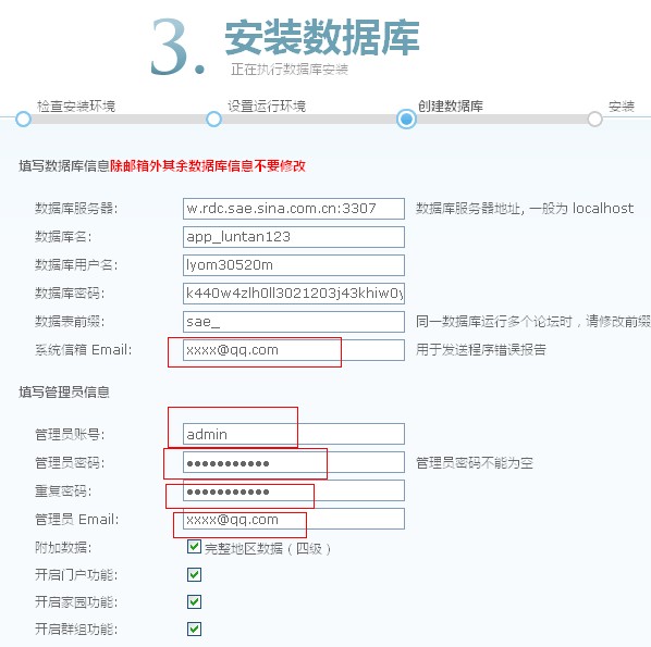 訪問安裝鏈接http://appname.sinaapp.com/install/ ,把a(bǔ)ppname改成你應(yīng)用二級域名的前綴。我剛才建的是luntan123,所以接著輸入