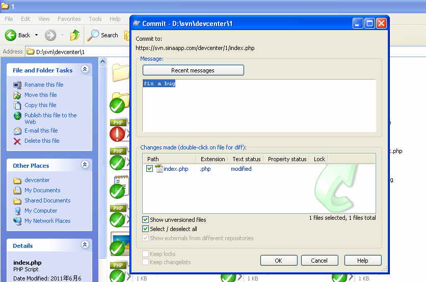 看,剛剛修改過(guò)的index.php變色了。下面需要提交(commit)最近的更新。在index.php文件上擊右鍵,出現(xiàn)菜單