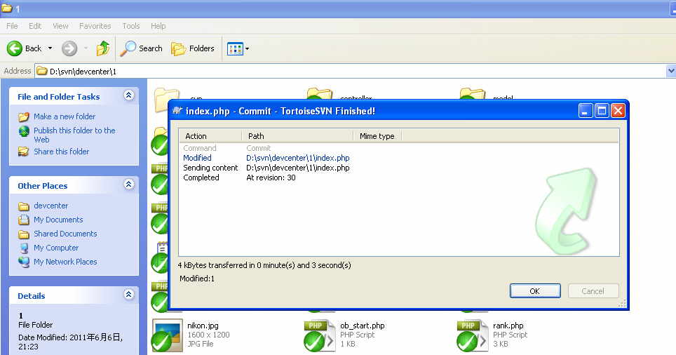 當(dāng)您看到如下圖所示,表明剛才的修改已經(jīng)成功提交,并且前該devcenter項(xiàng)目的SVN版本號(hào)加1,變成30.