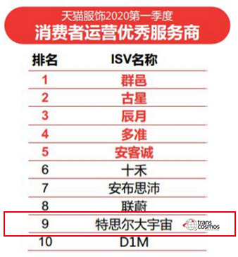 transcosmos集團(tuán)(以下簡(jiǎn)稱transcosmos;總部:日本東京;總裁兼COO:奧田昌孝)的獨(dú)資子公司上海特思爾大宇宙商務(wù)咨詢有限公司(以下簡(jiǎn)稱transcosmos China;總部:中國上海;CEO:山下榮二郎)在2020年2月天貓啟動(dòng)的服飾品類艦長GROW計(jì)劃中,基于天貓行業(yè)大數(shù)據(jù)及GROW(*1)2.0方法論,幫助服飾類目艦長(即頭部品牌)實(shí)現(xiàn)增長。并于4月獲評(píng)“天貓服飾2020第一季度消費(fèi)者運(yùn)營優(yōu)秀服務(wù)商”。