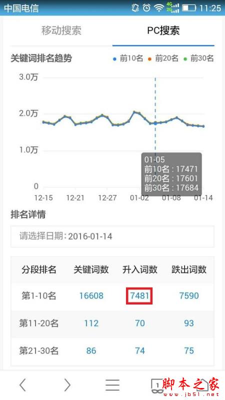 2.關(guān)鍵詞詳情頁,提供具體關(guān)鍵詞在PC搜索和移動(dòng)搜索下的近30天關(guān)鍵詞影響力、導(dǎo)流量和排名變化趨勢(shì)